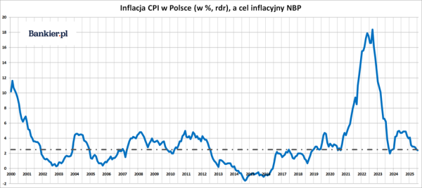 W grudniu 2025 roku wskaźnik cen towarów i usługdla konsumentów (CPI) był o 2,4% większy wporównaniu z takim samym miesiącem roku poprzedniego – wynika z wstępnegooszacowania Głównego Urzędu Statystycznego. Był to wynik ciut niższy odoczekiwań większości ekonomistów, którzy przewidywali, że pod koniec roku inflacjaCPI w Polsce utrzyma się na pułapie zbliżonym do 2,5-procentowego celu Narodowego BankuPolskiego.