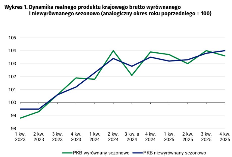 „W czwartym kwartale 2025 roku realny PKB po uwzględnieniu wahań sezonowych (w cenach stałych przy roku odniesienia 2020) powiększył się o 1 proc. w porównaniu z poprzednim kwartałem i był wyższy niż dwanaście miesięcy wcześniej o 3,6 proc. Realny PKB bez korekty sezonowej (w cenach stałych średniorocznych roku poprzedniego) wzrósł o 4 proc. w zestawieniu z analogicznym okresem poprzedniego roku” — czytamy w komunikacie GUS.