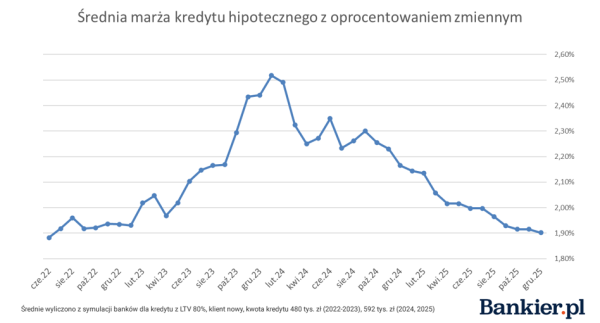 Średnia marża kredytów z oprocentowaniem zmiennym powróciła z bardzo dalekiej podróży. Na koniec grudnia 2025 r. wyniosła prawie dokładnie tyle, ile trzy lata wcześniej – 1,9 pp.