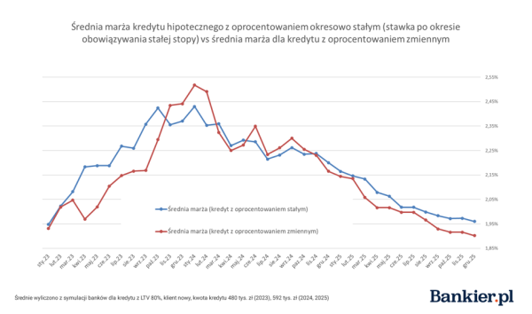 W nowych danych nie ma już także śladu po niepokojącym trendzie w bankowych cennikach sprzed około 2 lat. Wówczas marże dla kredytów z okresowo stałą stopą „rozjeżdżały się” z marżami dla zmiennego oprocentowania. Zakładaliśmy hipotezę, że klienci wybierający stałą ratę przez kilka lat ignorowali w porównaniach marże obowiązującą w dalszym okresie, a banki wykorzystały nadarzającą się szansę do podniesienia ceny. Miniony rok oznaczał powrót do normalności. Dla obu wariantów kredytów uśredniona marża zbliżyła się do siebie i, co istotne, obniża się. W grudniu 2025 r. marże dla stałoprocentowych kredytów uplasowały się na najniższym w obserwowanym okresie poziomie (średnia 1,96 pp.).