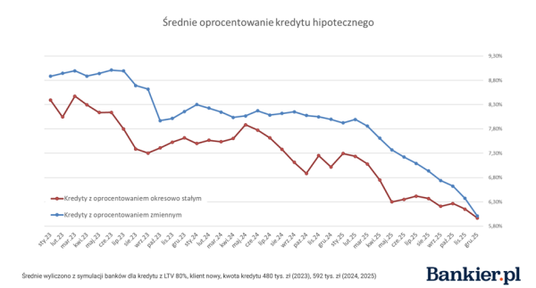 Oprocentowanie kredytów z czasowo stałą stopą spadło poniżej symbolicznej „szóstki”. W grudniu średnia uplasowała się na poziomie 5,97 proc. W czerwcu średnia z ofert banków wynosiła 6,35 proc., a na koniec III kwartału – 6,20 proc. Skala obniżek jest widoczna, gdy sięgniemy po bardziej odległe porównania. W styczniu 2025 r. wskaźnik wynosił prawie 7,3 proc., w styczniu 2024 r. – 7,5 proc., a w styczniu 2023 r. – 8,4 proc.