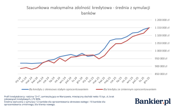 Trend wzrostu zdolności kredytowej zyskał impet, gdy w dół poszło oprocentowanie kredytów. Od maja 2025 r. linie na wykresie wznoszą się zdecydowanie szybciej, ale również tutaj dostrzegamy „konwergencję”. Zjawiskiem obserwowanym od początku serii podwyżek stóp procentowych było oferowanie przez banki kredytobiorcom decydującym się na stałą stopę nieznacznie wyższych kwot. Dostrzegaliśmy ten efekt w rankingach, chociaż nie w każdym miesiącu i nie w każdej instytucji (czasem za różnicę odpowiadał np. inny wariant produktu). Grudzień przyniósł jednak niemal zrównanie się maksymalnej szacunkowej zdolności kredytowej profilowych kredytobiorców dla obu wariantów zobowiązania.