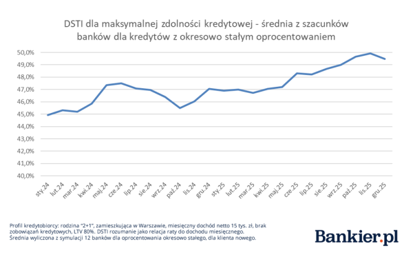 Średnia ze wskaźników DSTI lekko wzrosła w trzecim kwartale 2025 r., by osiągnąć szczyt w listopadzie. Zmiany miesiąc do miesiąca widoczne są zazwyczaj na drugim miejscu po przecinku, ale w dłuższej perspektywie nie można zaprzeczyć, że banki (uśredniając) poluzowały swoje podejście. To prawdopodobnie czynnik, który dodatkowo wzmacnia wzrost zdolności kredytowej.