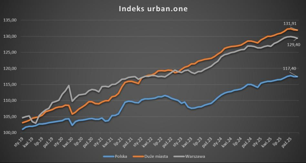 W grudniu 2025 r. bardziej zauważalnie zmniejszyła się wartość indeksu urban.one obliczanego dla Warszawy. W ostatnim miesiącu minionego roku odnotowano 129,4 pkt – o 0,34 pkt mniej niż w listopadzie, a jednocześnie o 3,01 pkt więcej niż w grudniu 2024 r.