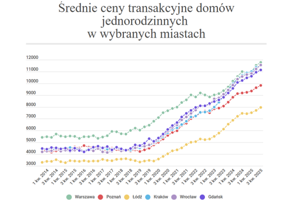 Z danych Bankier.pl, udostępnionych przez Cenatorium, wynika, że od 7 do 9 proc. wzrosły w skali roku średnie kwoty, które płacono za domy jednorodzinne w największych polskich miastach. W przeciwieństwie do mieszkań, zwłaszcza tych największych, w roku 2025 na rynku domów nie obserwowano spadków cen. Różnic jest jednak więcej.