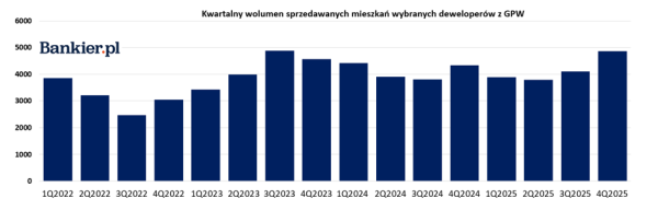 Według danych ze stycznia, pochodzących od deweloperów giełdowych, ich łączna sprzedaż mieszkań w IV kwartale 2025 r. była największa od czasu szczytu sprzedażowego w 2023 r., który wywołało wprowadzenie przez rząd programu dopłat do kredytów. Indeks branżowy zmierza w kierunku historycznego rekordu, ustalonego w okresie bańki na rynku nieruchomości niemal 20 lat temu.