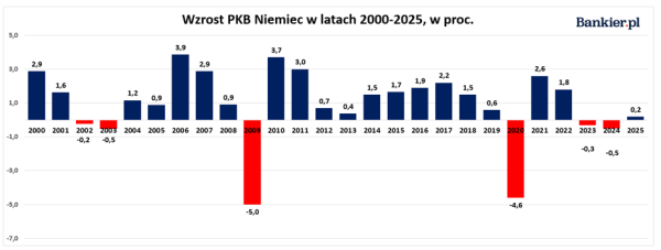 Statystycy nie mają dobrych wieści po dwóch latach recesji w niemieckiej gospodarce. Wstępny szacunek rocznej dynamiki PKB sugeruje, że komentarze na temat dramatycznego stanu największej gospodarki UE nie są przesadzone. Co prawda udało się dorównać niskim prognozom, ale wynik po kilku latach regresu brzmi jak smutny żart, a przewidywania na przyszłość nie są obiecujące, zwłaszcza że, jak pokazał rok 2025, nawet te mało wymagające, mogą się nie spełnić.