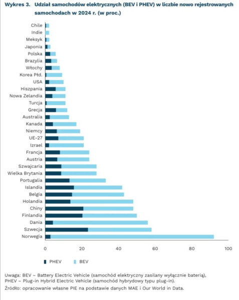 Z raportu wynika, że aktualnie 48 proc. nowych aut rejestrowanych w Chinach stanowią pojazdy elektryczne. Jest to wynik gorszy jedynie od tego, który obserwujemy w krajach skandynawskich, gdzie prym wiedzie Norwegia (92 proc.). Jednocześnie, jest to rezultat o ponad 25 pkt. proc. wyższy od średniej dla krajów UE-27.